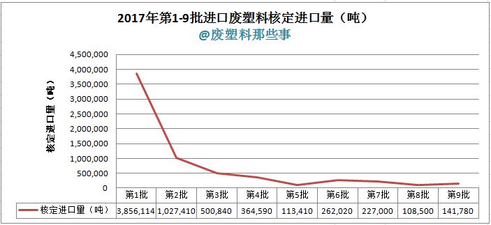 2017年4月21日,第9批廢塑料進口批文公示,這次僅有15家企業獲得了批文,核定進口量141,780噸。我們來看看環保部公示的2017年前9批所發放的廢塑料進口批文數量統計圖。