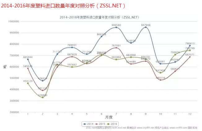 從2014年—2016年廢塑料進口數量圖中看出,2014年與2015年12月進口數量依舊呈上升趨勢,2016年12月廢塑料進口數量開始呈下降趨勢。