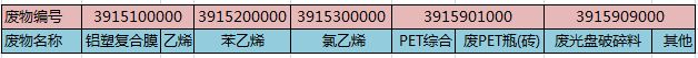 限制進口可用作原料的固體廢塑料有5個編號,每個編號對應的廢物名稱為