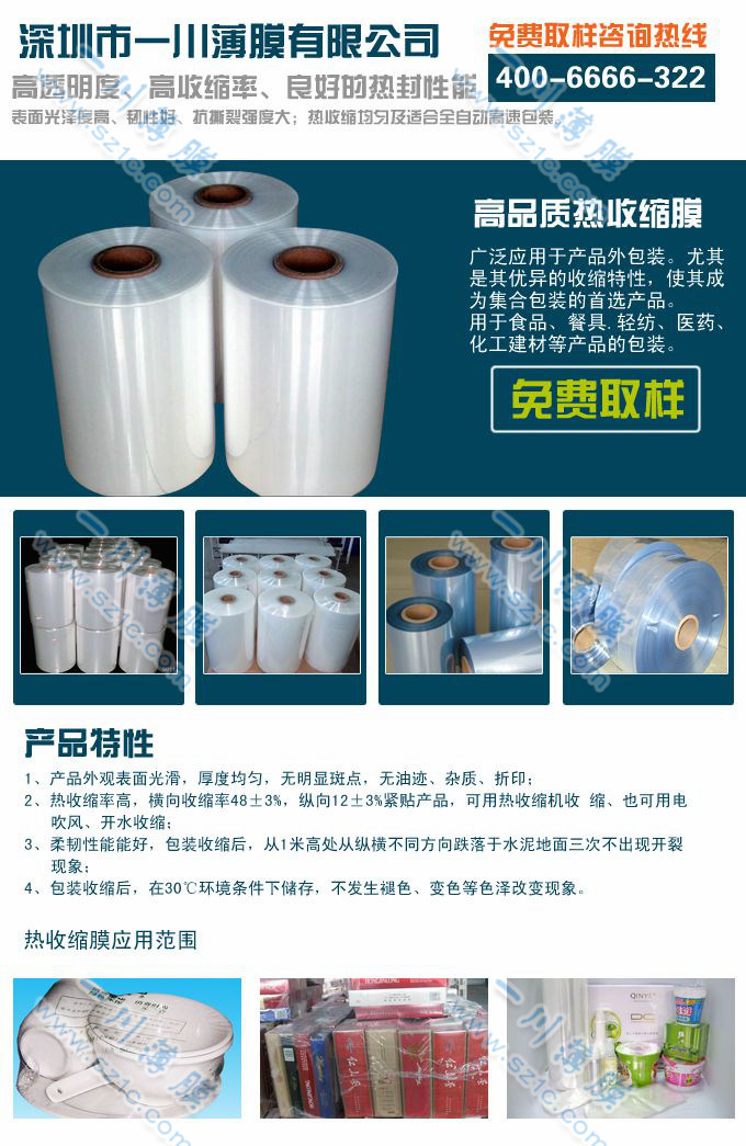 PVC熱收縮膜系用PVC樹脂跟十幾種輔料混合后二次吹脹而成,其特點是透明度好、易收縮、強度高、收縮率可以根據用戶需要自由調整,可操作性強。