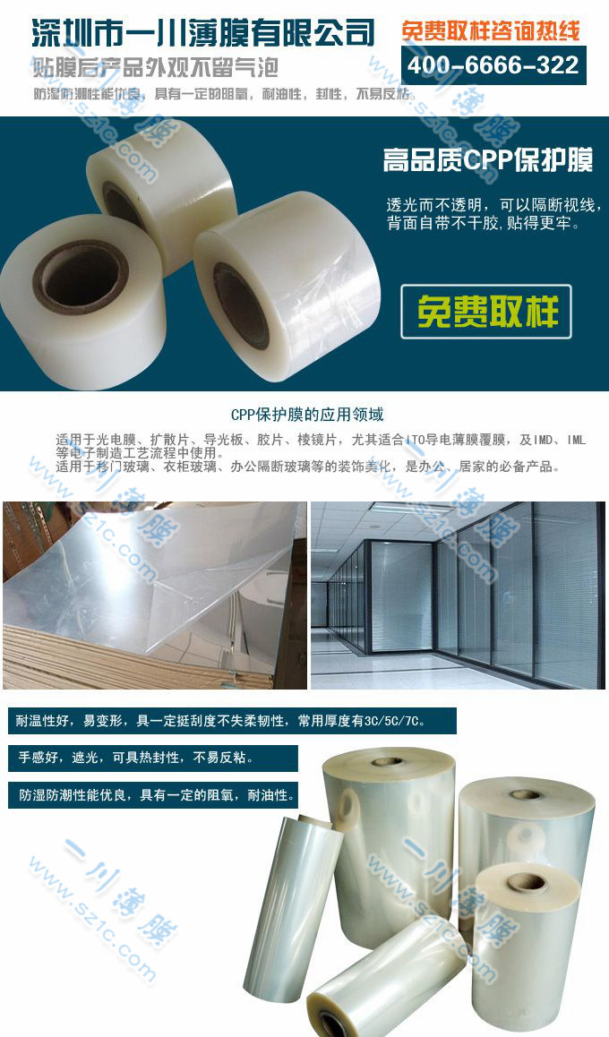 CPP保護膜主要適用于光電膜、擴散片、導光板、膠片、棱鏡片,尤其適合ITO導電薄膜覆膜,及IMD、IML等電子制造工藝流程中使用。