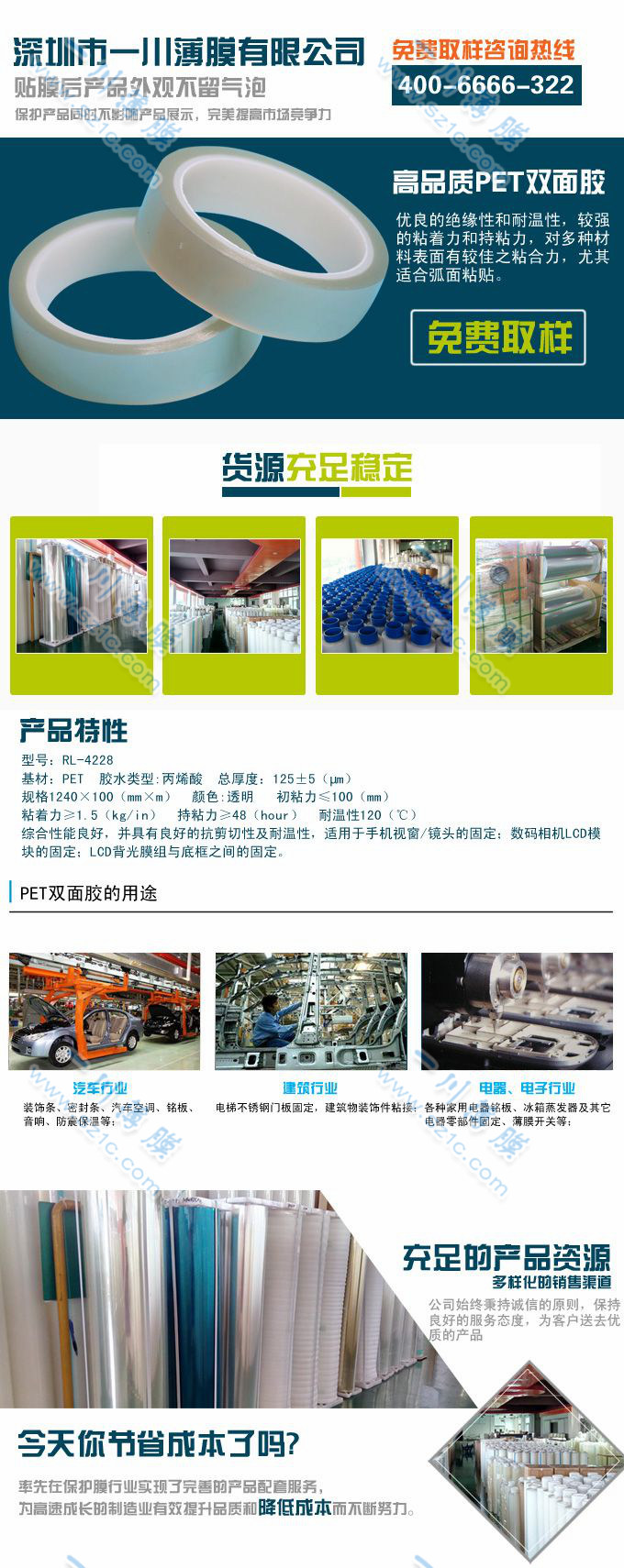 PET透明雙面膠帶以PET為基材,兩面涂壓克力膠水,具有優(yōu)良的絕緣性和耐溫性,較強(qiáng)的粘著力和持粘力,對(duì)多種材料表面(PET、PP、PE、PVC、ABS、PC、鋁材、鋼材等)有較佳之粘合力,尤其適合弧面粘貼(抗反彈性佳)。特別對(duì)PET薄膜具有較強(qiáng)的粘著力,廣泛用于薄膜開(kāi)關(guān)的絕緣間隔片,銘板,標(biāo)牌,面板,手機(jī)按鍵等!