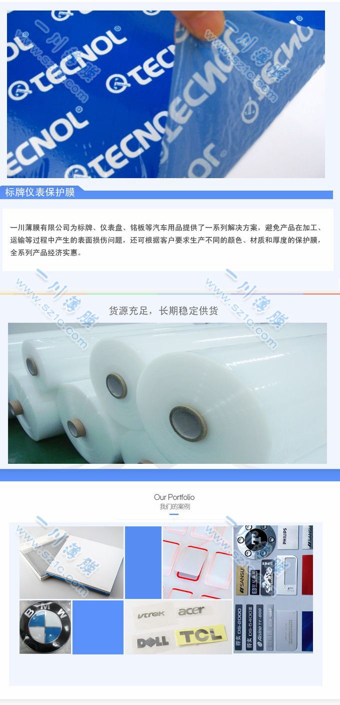 一川薄膜有限公司為標牌儀表盤銘板等汽車用品提供了一系列解決方案,避免產品在加工、運輸等過程中產生的表面損傷問題,還可根據客戶要求生產不同的顏色、材質和厚度的保護膜,全系列產品經濟實惠