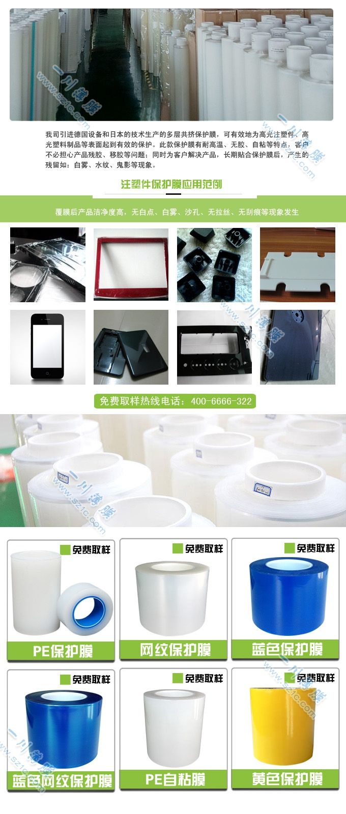 塑膠后蓋高溫保護,高光注塑件,塑料板材面材保護膜,塑膠盒保護膜我司引進德國設備和日本的技術生產的多層共擠保護膜,可有效地為高光注塑件、高光塑料制品等表面起到有效的保護。此款保護膜有耐高溫、無膠、自粘等特點,客戶不必擔心產品殘膠、移膠等問題;同時為客戶解決,產品長期貼合保護膜后,產生的殘留如:白霧、水紋、鬼影等現象。